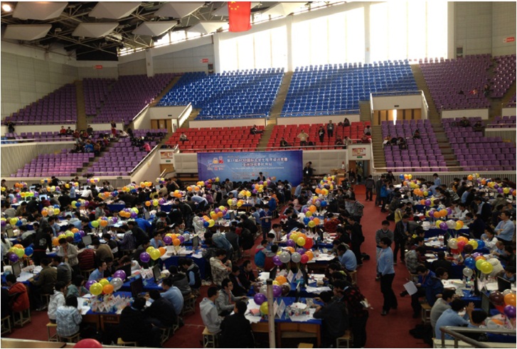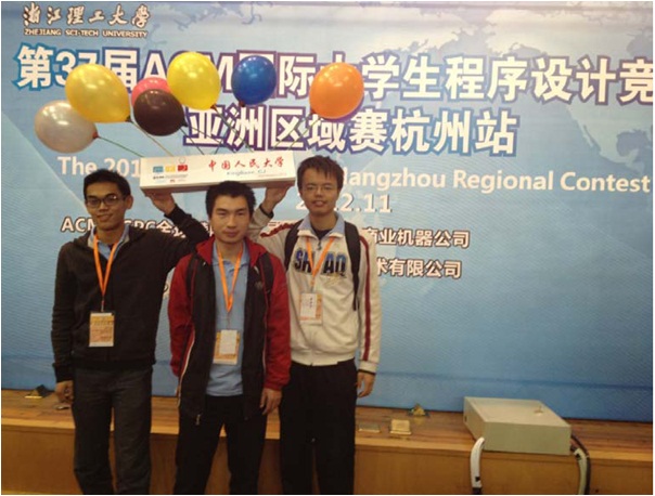 亚洲区杭州现场赛激烈紧张,来自92所学校的141支参赛队和来自谷歌及12所学校的16支非正式参赛队共157队参加了比赛。选手们奋力拼搏。本次比赛按照ACM-ICPC竞赛规则,全部英语命题共11道题。涉及知识面广泛,包括图论,数据结构,模拟,动态规划,计算几何,线性规划,搜索等。考验了选手的问题分析能力,算法实现能力,限时和高压力下编写程序的能力。在五个小时紧张激烈的比赛中,我校Kingbase_CJ队依靠扎实的计算机功底,平时的勤奋努力,缜密的思维以及团队合作精神,沉着冷静、坚持不懈、奋勇拼搏,最终在包括清华大学、北京大学、上海交大、浙江大学、复旦大学、中山大学、电子科技大学、北京邮电大学等大陆和香港157多支代表队中勇夺金牌。